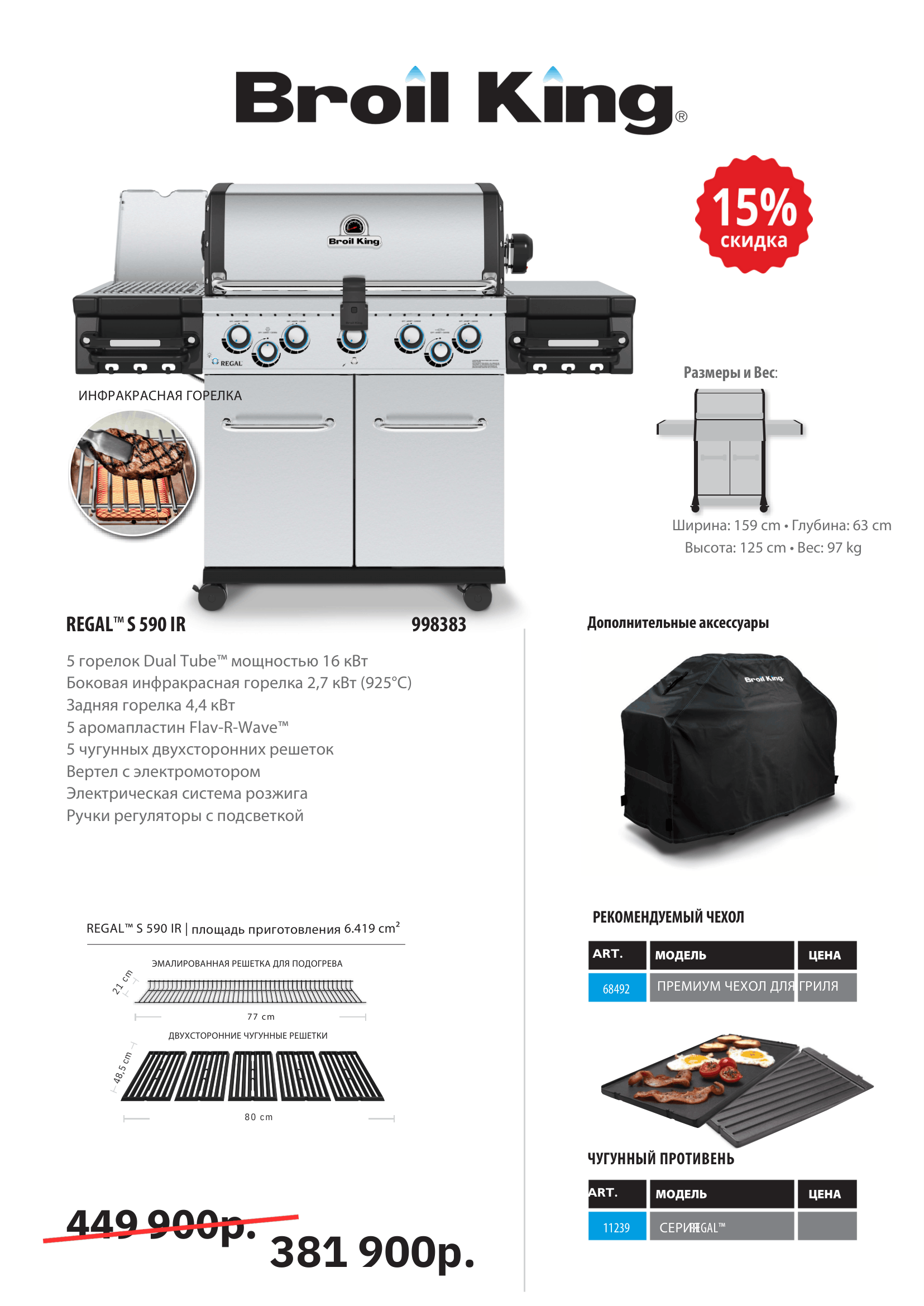 - Мощность горелок (кВт): 16 — основные; 3,1 — боковая инфракрасная; 4,4 — задняя;
